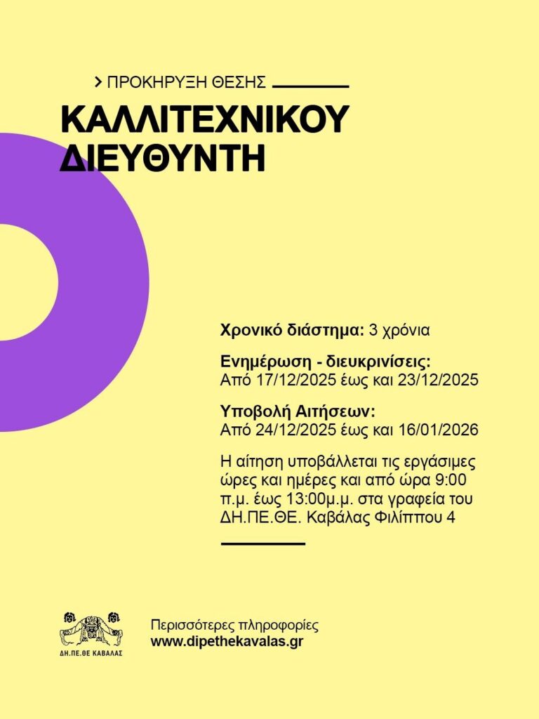 Το ΔΗ.ΠΕ.ΘΕ. Καβάλας προκηρύσσει την πλήρωση με επιλογή μίας (1) θέσης Καλλιτεχνικού Διευθυντή ΠΕ ή ΤΕ ή ΔΕ επί θητεία με σχέση εργασίας Ιδιωτικού Δικαίου Ορισμένου Χρόνου για διάστημα τριών (3) ετών.