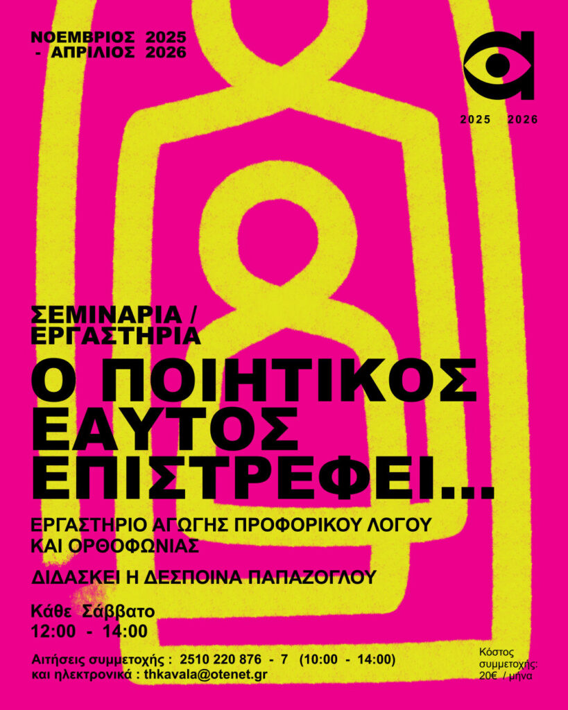 Το ΔΗ.ΠΕ.ΘΕ. Καβάλας συνεργάζεται ξανά με τη Δέσποινα Παπάζογλου (Ηθοποιός, Δασκάλα Θεραπευτικής Yoga, Ενεργειακή Θεραπεύτρια του Reiki) για να διοργανώσουν το εργαστήριο Αγωγής του Προφορικού Λόγου και Ορθοφωνίας.