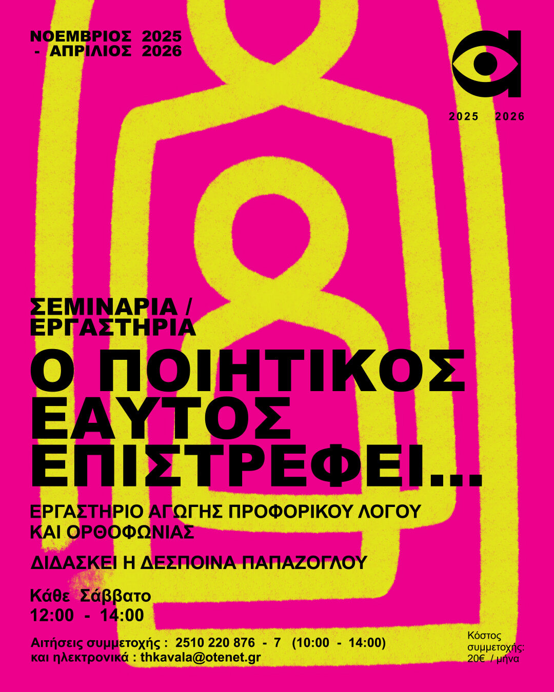 *Η πρώτη ανοιχτή συνάντηση γνωριμίας θα λάβει χώρα το Σάββατο 1 Νοεμβρίου 2025 στις 12:00 στο Θέατρο Αντιγόνη Βαλάκου και στη συνέχεια κατόπιν συνεννόησης με τους συμμετέχοντες θα οριστικοποιηθούν οι μέρες/ώρες του εργαστήριου.