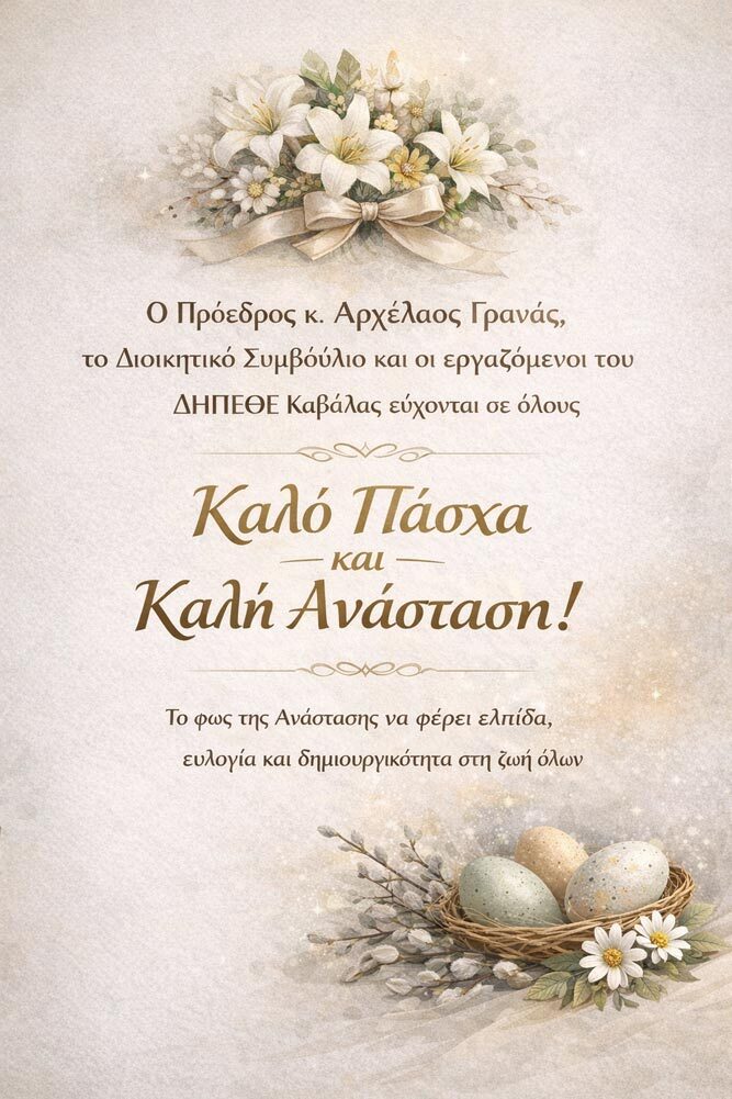 Ο Πρόεδρος κ. Αρχέλαος Γρανάς, το Διοικητικό Συμβούλιο και οι εργαζόμενοι του ΔΗΠΕΘΕ Καβάλας εύχονται σε όλους Καλό Πάσχα και Καλή Ανάσταση!