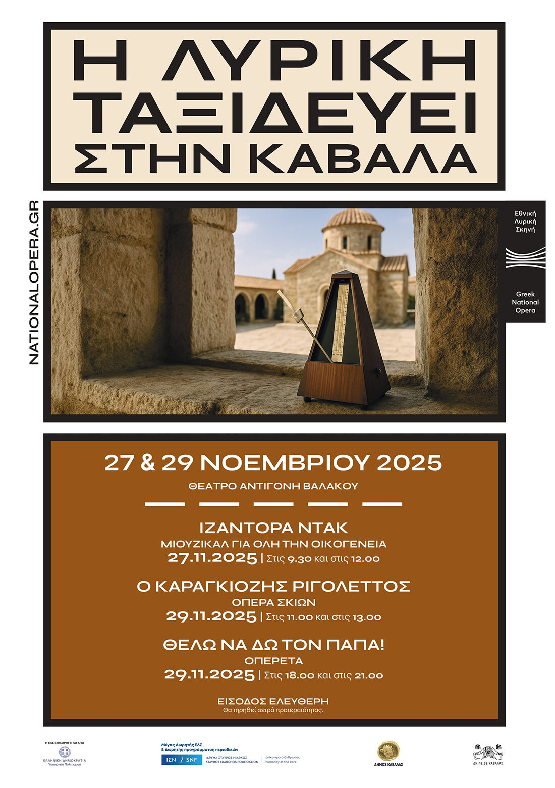 Το ΔΗΠΕΘΕ Καβάλας υποδέχεται στη σκηνή του θεάτρου Αντιγόνη Βαλάκου, την Εναλλακτική Σκηνή της Εθνικής Λυρικής Σκηνής, που έρχεται με τρείς παραγωγές, το μιούζικαλ για παιδιά «Ιζαντόρα Ντακ» (Πέμπτη 27 Νοεμβρίου), τη νέα όπερα σκιών Ο Καραγκιόζης Ριγολέττος και την απολαυστική οπερέτα του Θεόφραστου Σακελλαρίδη «Θέλω να δω τον Πάπα!» (Σάββατο 29 Νοεμβρίου 2025).